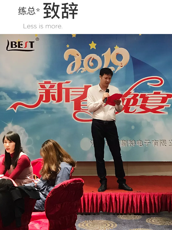 休息后,百斯特電子全員盛裝出席新春晚宴,晚宴在祥和而熱烈的氣氛中開(kāi)始,首先由公司總經(jīng)理練總致辭,在這辭舊迎新,歡聚一堂的時(shí)刻,練總首先向全體員工致以誠(chéng)摯的祝賀!回首2018,全體員工不辭辛苦,兢兢業(yè)業(yè)。公司的業(yè)務(wù)節(jié)節(jié)高升,取得了有目共睹,可喜可賀的成績(jī)。2019公司將聚焦現(xiàn)有產(chǎn)品,發(fā)展新產(chǎn)品,只要我們滿懷信心,攜手共進(jìn),我們一定能創(chuàng)造一個(gè)更加美好的明天!